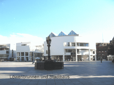 Der Löwenbrunnen auf dem Münsterplatz mit dem vom New Yorker Architekten Richard Meier erbauten Stadthaus