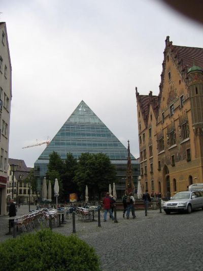 Das Rathaus, hier die Südseite, mit der Glaspyramide daneben.